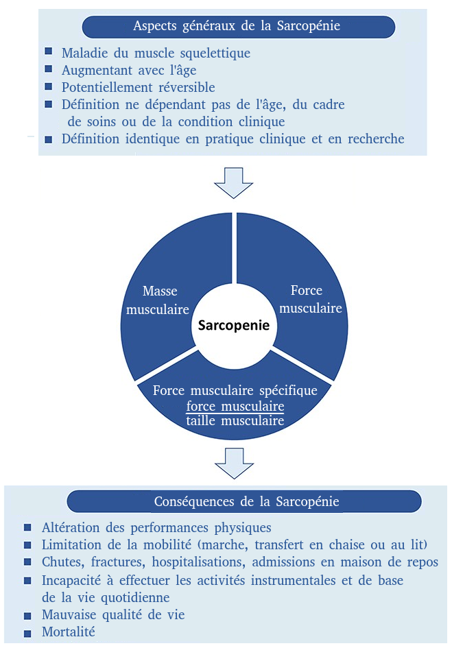 La sarcopénie est caractérisée par une perte de masse musculaire liée à l’âge et une diminution de la force et des fonctions musculaire. Elle est associée à des risques accrus de chutes, d’incapacités et de mortalité.